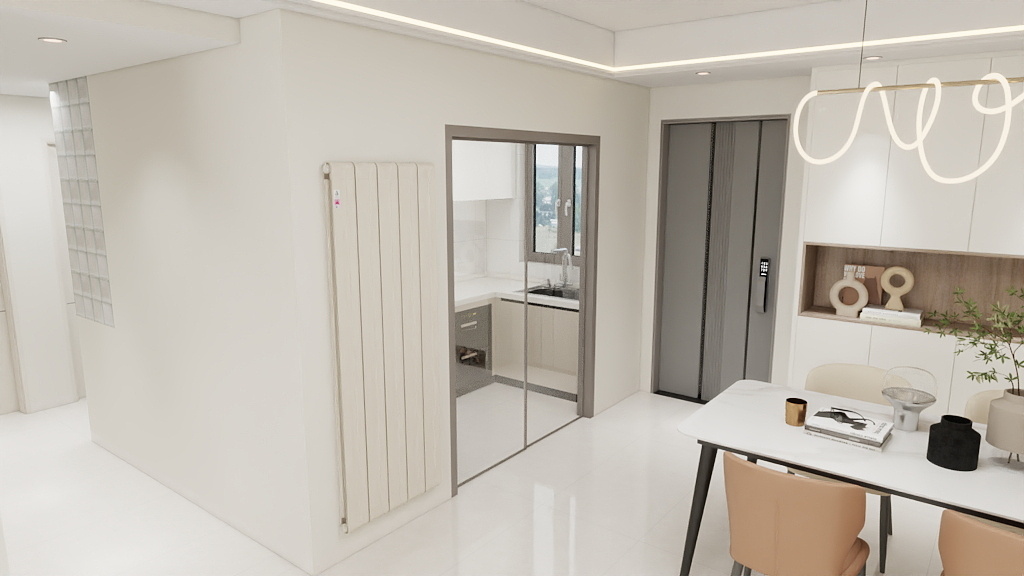 定制圆弧边角的钢制辉达娱乐,模仿奶油风中常见的拱形门、圆角家具,统一空间语言。 -