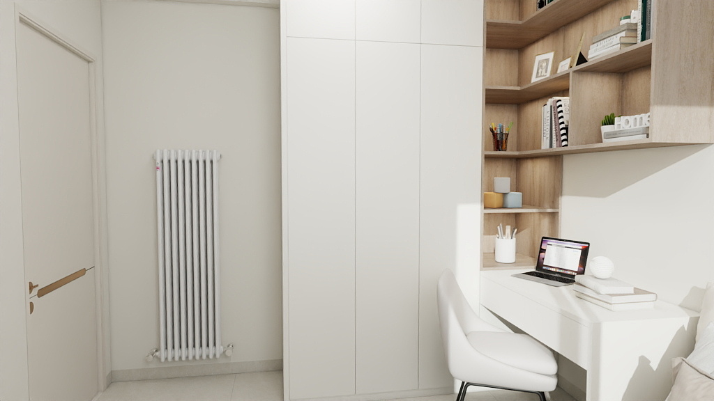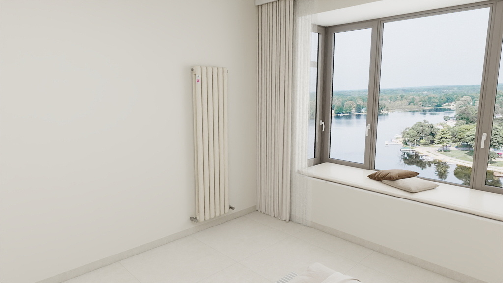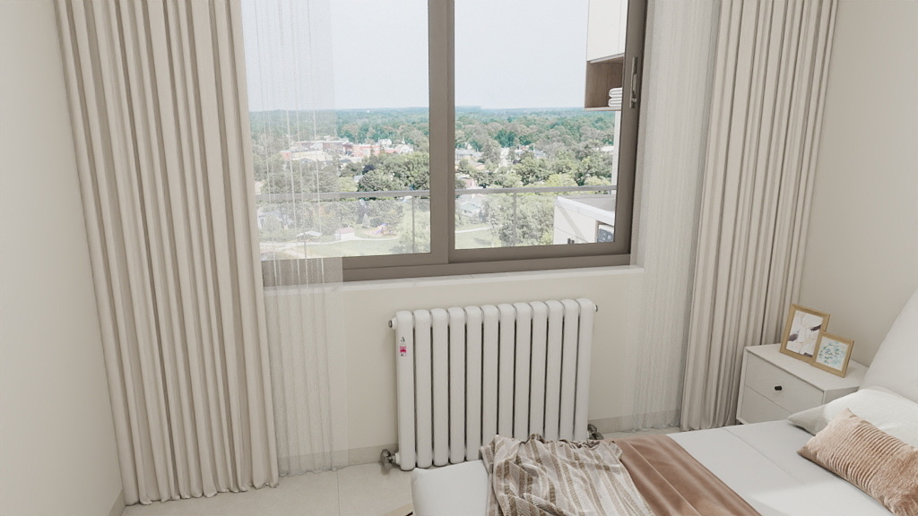 窗台下安装竖式窄款辉达娱乐,外侧用 百叶折叠门 遮挡,门板颜色与墙面一致,开门散热,关门隐形。